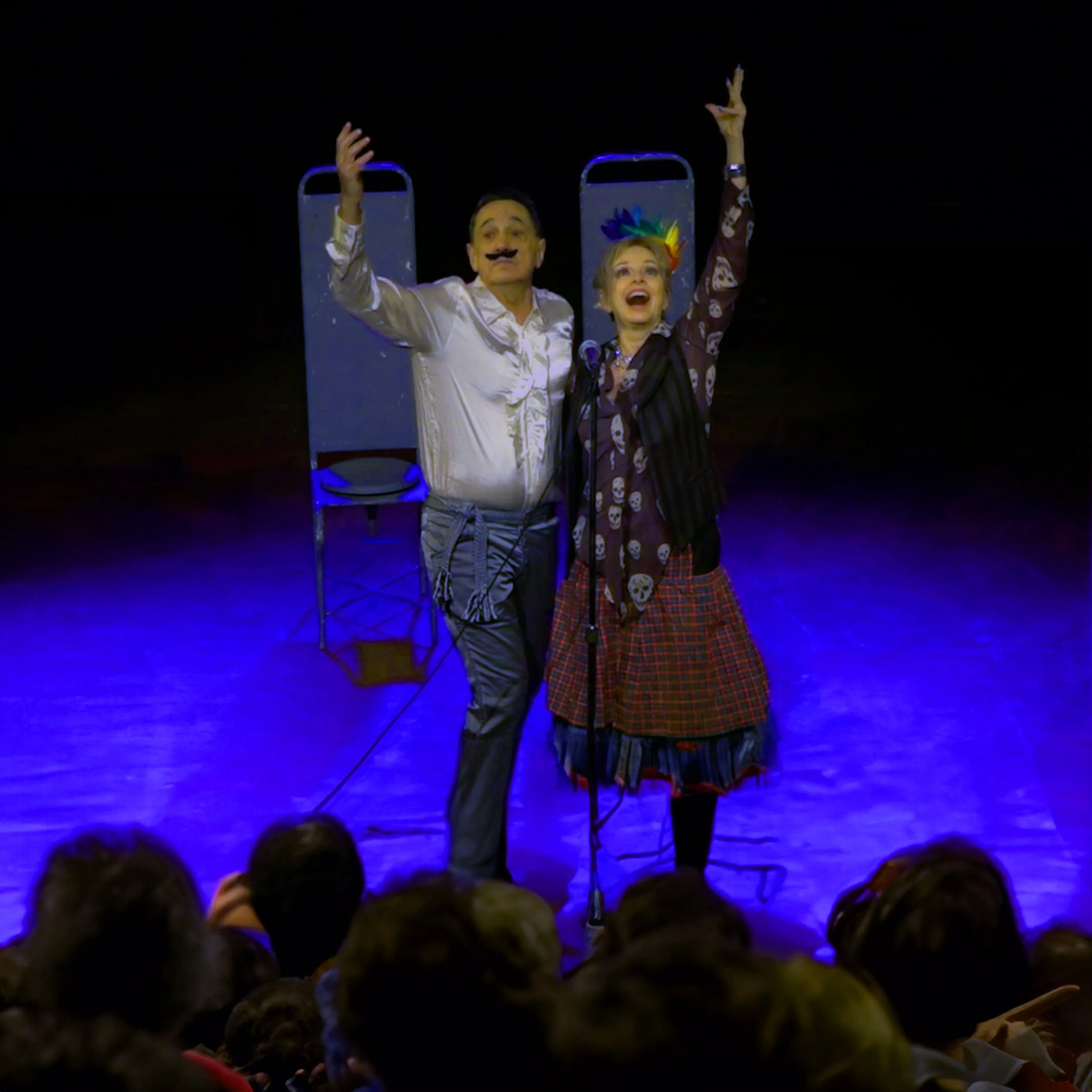 Two ancient vaudevillians hang in a surreal Dada world, somewhere outside time and space.